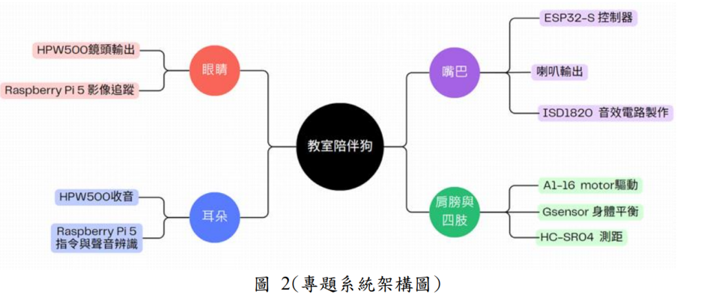 「教室陪伴狗」3D列印以及壓克力的方式組裝主,並以Arduino Mega 2560為核心控制A1-16伺服馬達和使用MAX3010等周邊測情緒,搭配IC ISD1820發出提示聲,Raspberry Pi5進行影像語音辨識達成陪伴狗核心功能。