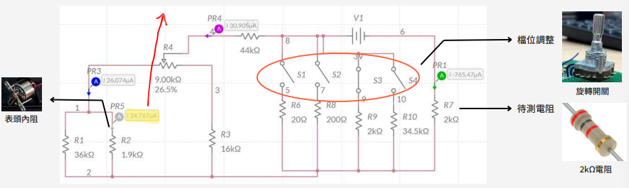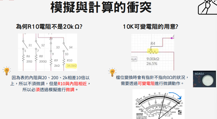 - 電路調校:在 R X10kΩ檔位卡關很久,後來才發現自己忽略了必須將電壓調高至 12V 的等效關係。這次疏忽讓我學會更細心地去推導理論數值,並主動修正錯誤。